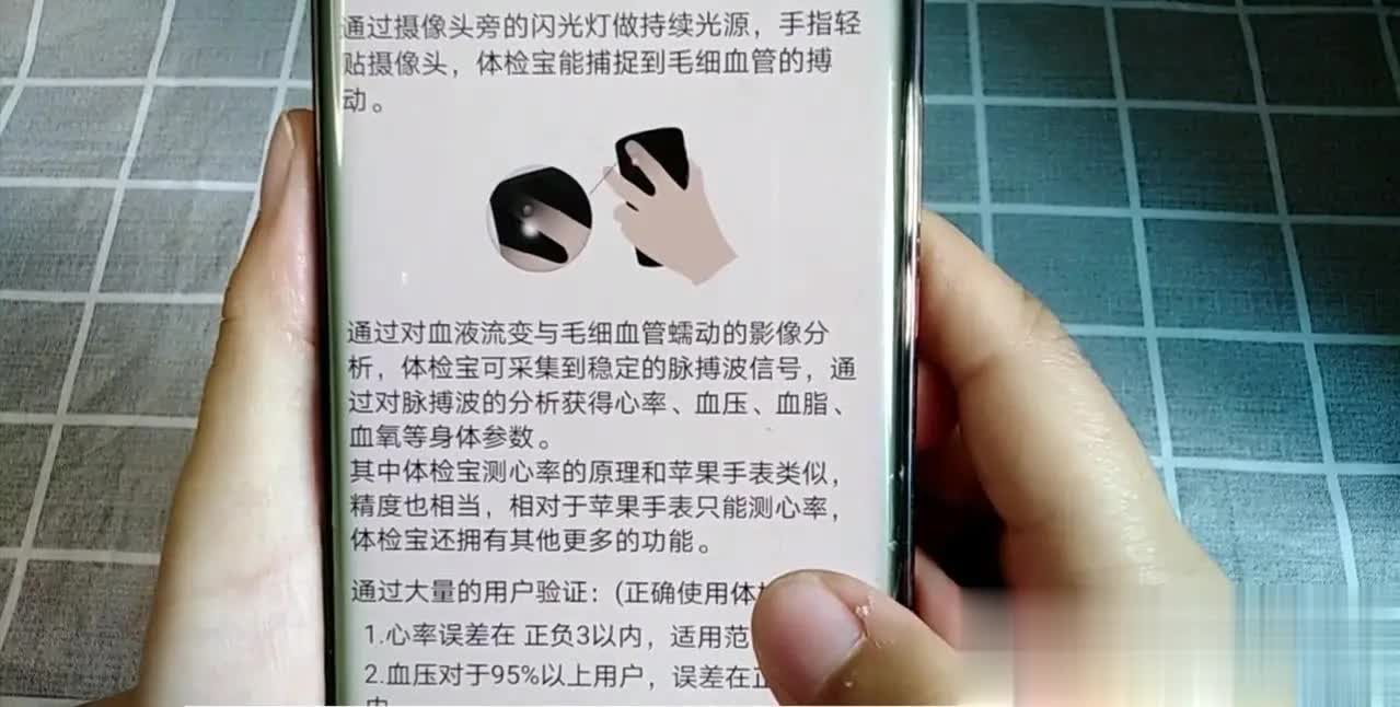 通过对血液流变与毛细血管蠕动的影像分析,体检宝可采集到稳定的脉搏波信号。通过对脉搏波的分析获得心率、血压、血脂、血氧等身体参数。它这里,也写着心率的误差在正负三以内,适用范围50到150。血压对于95%以上的用户,误差在正-12以内。血压对于92%以上的用户,误差在正-2以内。
