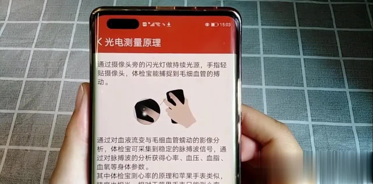 如果确实不舒服,我们还是得去医院。可能很多人,也好奇它的测量原理是什么?我们在血压测量的页面,右上角这里就有一个测量原理,我们可以把它点开,点开之后,它这里都有详细的说明。也就是通过摄像头旁边的闪光灯,做持续光源,手指轻轻的贴摄像头,体检宝就能捕捉到我们毛细血管的波动。